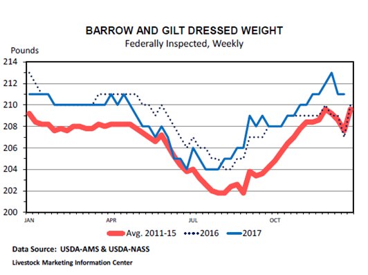 2017年生豬屠宰量依然跟隨著季節(jié)性模式。在2017第四季度年同比增加也是通常的典型情況,并高于同期前幾個月水平。11月和12月上半月溫和的中西部天氣能有利于提高育肥重量。生豬重量在2016年年底出現(xiàn)異常,年同比并沒有增加(或者說是相較于前5年的平均水平也沒有增加,請見圖表)。