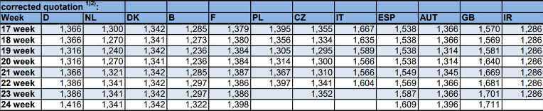 法國生豬價(jià)格上漲幅度1.2歐分,法國供屠宰的生豬數(shù)量在下降。奧地利和德國上漲3歐分。奧地利生豬數(shù)量下降15%,主要原因是天氣太熱。西班牙生豬體重在下降。荷蘭和丹麥生豬價(jià)格沒有變化。丹麥生豬價(jià)格已經(jīng)連續(xù)11周保持不變。德國四家大型屠企(Toennies、Vion、Westfleisch、Danish
