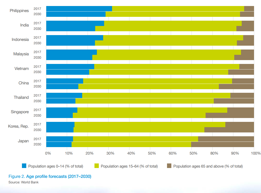 另一個影響亞洲的是明顯的人口結(jié)構(gòu)變化。到2050年亞太地區(qū)超過25%的人口是60歲以上,較2016年數(shù)量翻番。韓國和日本已經(jīng)是老齡化國家,中國開始出現(xiàn)老齡化問題。(圖二:2017-2030年年齡結(jié)構(gòu)預(yù)測)