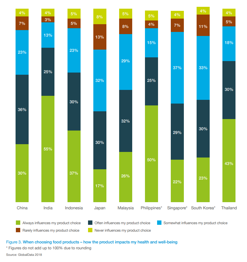 隨著生活水平和受教育程度提高,亞洲消費(fèi)者越來越關(guān)心健康問題。與此同時,飲食結(jié)構(gòu)引發(fā)的慢性病越來越多,消費(fèi)者更加注重食品對于健康的影響。超半數(shù)亞洲受訪者認(rèn)為食品對健康的影響是選擇購買時的考慮因素。中國和越南將食品安全作為消費(fèi)首要考慮因素。不到1/3的中國消費(fèi)者和25%的日本消費(fèi)者認(rèn)為瘦肉更健康。中國和日本消費(fèi)者對肥肉并不抗拒。但是,在日本女性消費(fèi)者認(rèn)為羊肉更健康。(圖三:選購食品——食品如何影響健康和福祉)(表一:選購肉類產(chǎn)品,哪種肉制品,你認(rèn)為是健康的)