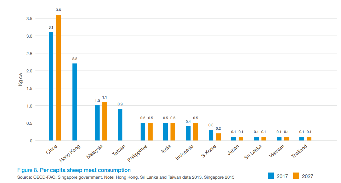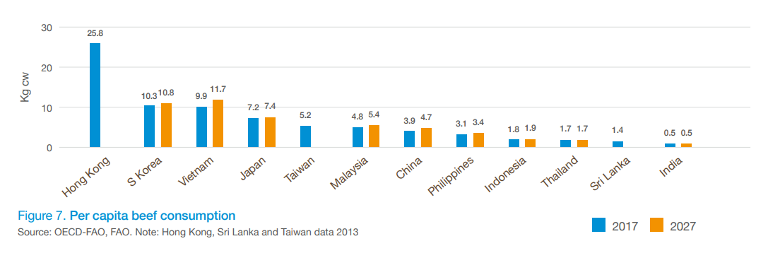 到2027年預(yù)計越南豬肉和牛肉消費(fèi)增長幅度最大,中國羊肉消費(fèi)增長幅度最大。(圖六-八:豬肉/牛肉/羊肉人均消費(fèi)量)