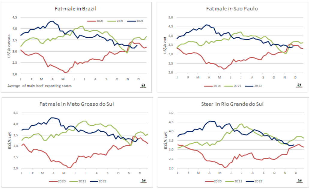 Agrifatto咨詢公司的畜牧經(jīng)理預(yù)測(cè),隨著公牛和母牛屠宰量的同步增加,牛肉價(jià)格應(yīng)該在年末幾周下降。在馬托格羅索的一次采訪中,他說,在消費(fèi)較低的時(shí)候,市場(chǎng)上肉類供應(yīng)增加,這應(yīng)該會(huì)轉(zhuǎn)化為終端消費(fèi)下個(gè)的下降。農(nóng)民已經(jīng)感受到了價(jià)格的下降,與去年同期相比,育肥牛價(jià)格下降了11%,但消費(fèi)者還沒有感受到。Agrifatto預(yù)測(cè),隨著國(guó)內(nèi)市場(chǎng)的供應(yīng)進(jìn)一步增加,牛肉價(jià)格的下跌將持續(xù)到2023年。