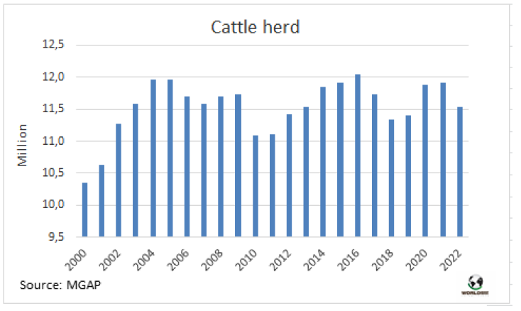 上半年烏拉圭牛存欄較預(yù)期減少35.1萬頭