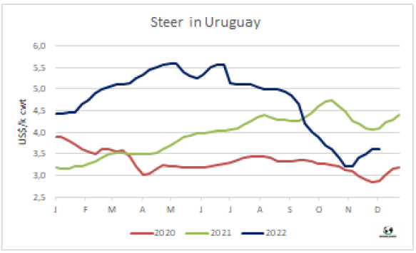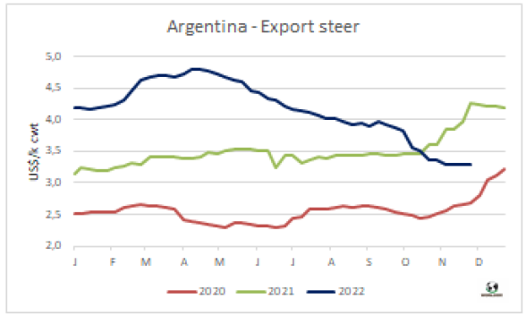 南方共同市場(chǎng)閹牛價(jià)格指數(shù)離開過去五周的窄幅波動(dòng)區(qū)間,本周該指數(shù)上漲了6美分,至3.37美元/公斤,主要受巴西牛價(jià)上漲的拉動(dòng)。巴西主要出口州育肥牛價(jià)格上漲11美分至3.25美元/公斤,主要因?yàn)槔讈啝杻r(jià)格上漲,以及匯率升值1.5%。巴拉圭方面,價(jià)格也有上漲,待宰閹牛價(jià)格上漲了10美分至3.3美元/公斤。阿根廷方面,出口閹牛比索價(jià)格上漲匯率下降導(dǎo)致美元價(jià)格下跌2美分至3.58美元/公斤。烏拉圭連續(xù)四周的上漲趨勢(shì)停止,本周牛價(jià)保持3.6美元/公斤。