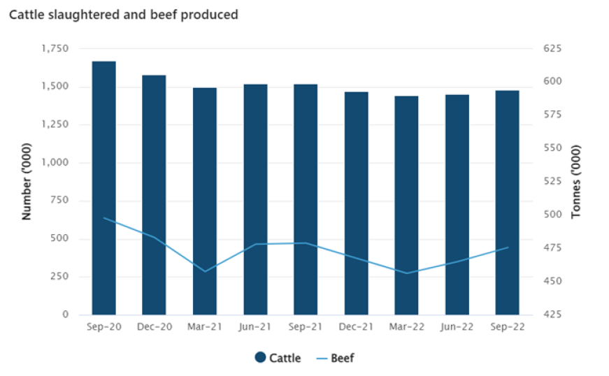 據(jù)報(bào)道,與2022年7月相比,澳大利亞在2022年9月當(dāng)季牛屠宰量增加了1.9%至150萬頭,牛肉產(chǎn)量增長(zhǎng)了2.3%至475628噸。在年度比較中,屠宰量同比下降了2.5%,產(chǎn)量同比下降了0.7%。母牛的屠宰率達(dá)44%,這表明今年最后一個(gè)季度牛群的重建仍在繼續(xù)。另一方面,全國(guó)羊屠宰量同比增長(zhǎng)了2%,至592萬頭,羊肉產(chǎn)量同比增長(zhǎng)7.2%,至14.51萬噸。