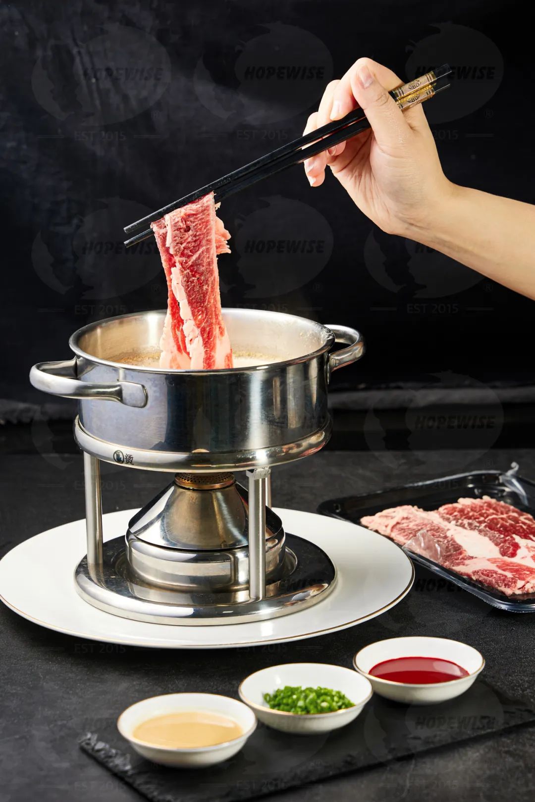 阿根廷谷飼牛前胸可直接切片涮火鍋,也可分切出中式火鍋的胸口油,瘦肉部分可用來(lái)炒制。推薦直接切片,油脂和瘦肉參半,有別于傳統(tǒng)中式胸口油,瘦肉部位肉感十足,香味濃郁,油脂部分爽口彈牙;而且裝盤(pán)美觀(guān),更具特色;另外,從廚房操作效率及定價(jià)方面來(lái)說(shuō)也更具優(yōu)勢(shì)。
