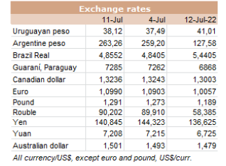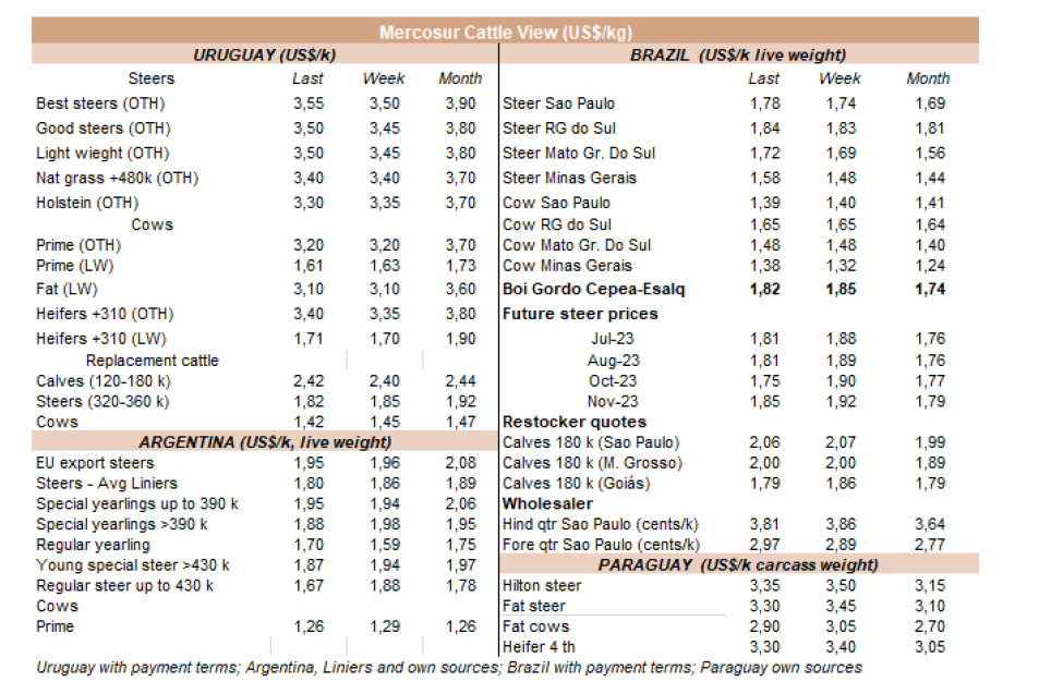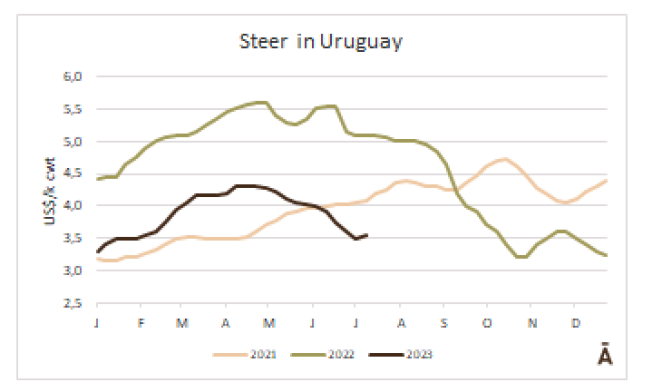 烏拉圭的價格也有所增加,特制公牛的價格以每公斤3.55美元出售,比前一周增加了5美分。