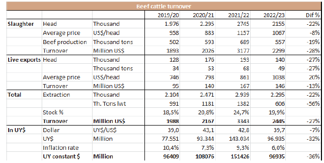 2022和2023年烏拉圭肉牛肉營業(yè)額減少約9億美元