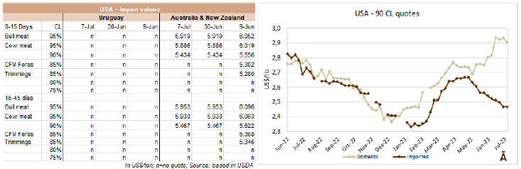 在這種情況下,烏拉圭向美國銷售的肉類價格基本穩(wěn)定,90Cl非配額參考價格保持在4000美元/噸CFR,95Cl保持在4250美元/噸