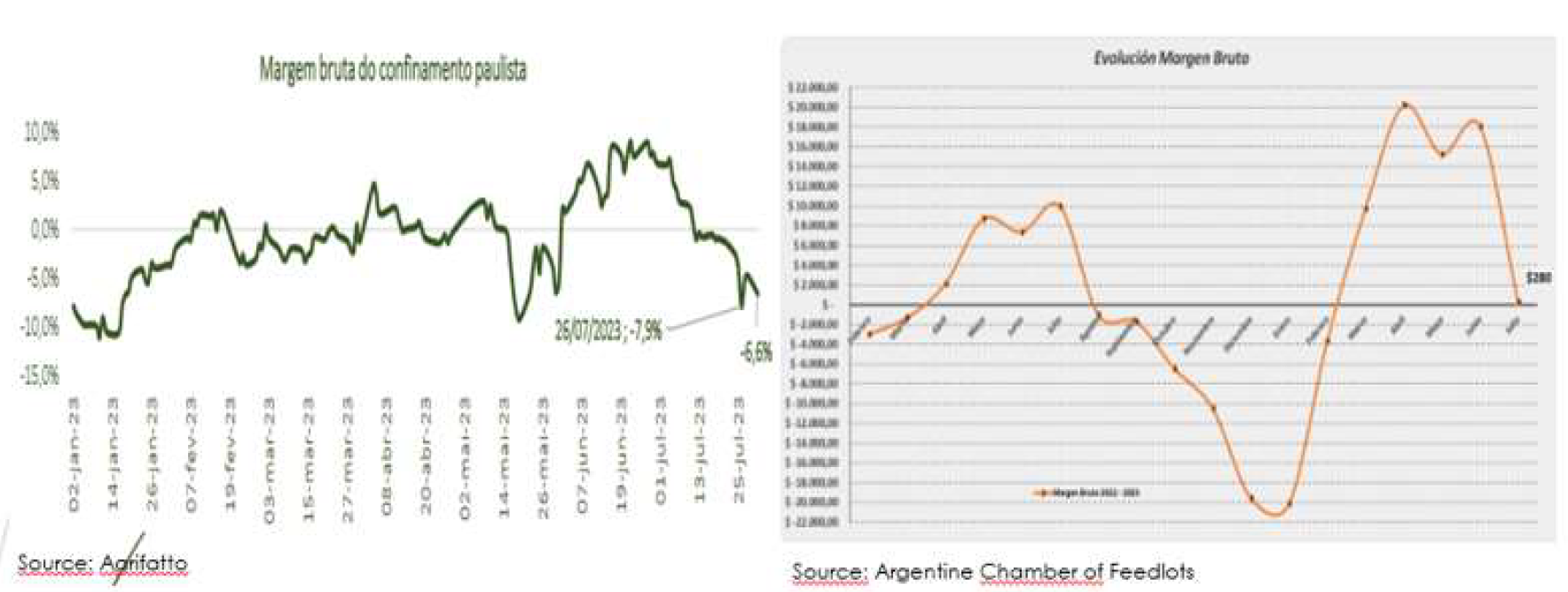 一位分析師稱,適合出口到中國的牛可能會減少,但無論如何,供應都不會減少,飼養(yǎng)場的牛數(shù)量將達到700萬頭。在圣保羅,飼養(yǎng)場7月份的數(shù)字為負數(shù),26日達到7.9%。盡管玉米價格明顯下降,牛的價格保持相對較低,被送往屠宰場牛的價格下跌使數(shù)字變紅。阿格里法托說:“隨著10月23日育肥牛的價格將降至249雷亞爾/15公斤以下,超過了過去60天16%的成本下降,飼養(yǎng)場毛利率顯示負數(shù)。因此,預計10月和11月屠宰的動物數(shù)量會減少是合理的。