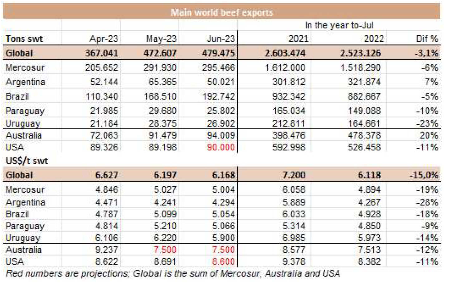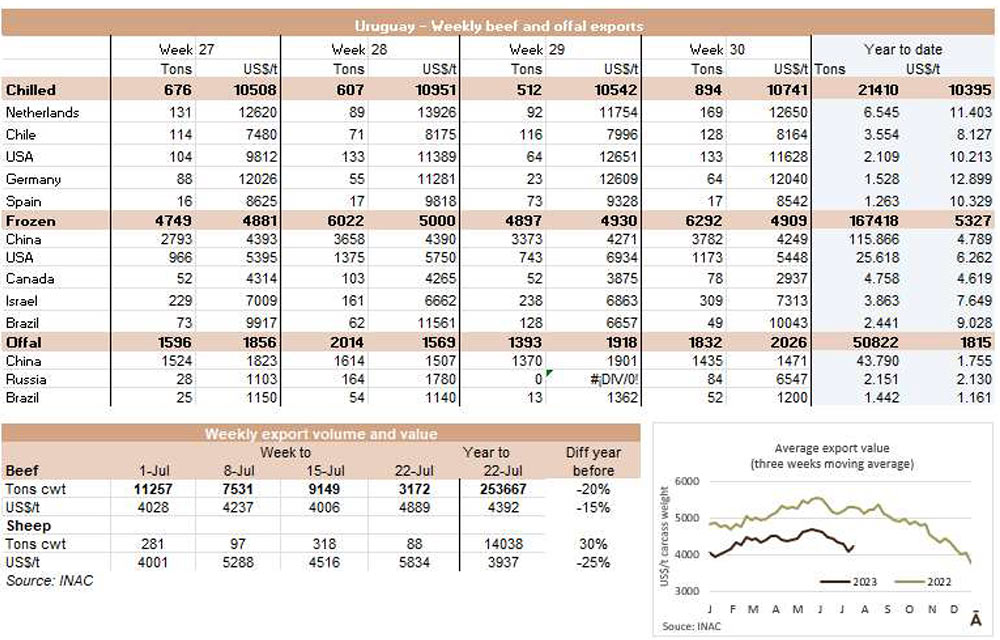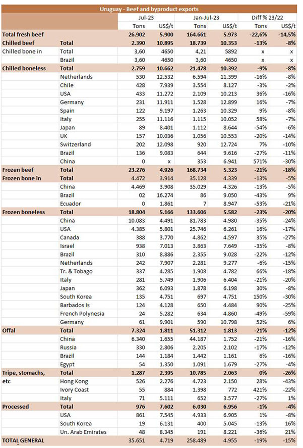 烏拉圭7月份出口了26038噸牛肉,和六月份的數(shù)據相似,比2022年7月增加了約1500噸。這是今年出口同比增長的第一個月,平均出口價格為每噸5534美元,比上月下降了240美元(-4.2%),是今年迄今為止的最低月度平均值。