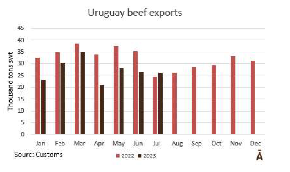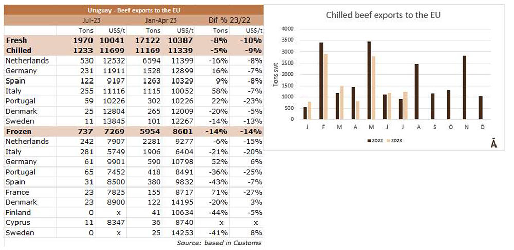 在截至7月的一年中,烏拉圭向歐盟國家出口了17122噸牛肉,比2022年同期減少了8%。主要是冷凍食品的下降,為14%, 冰鮮產品下降了5%。