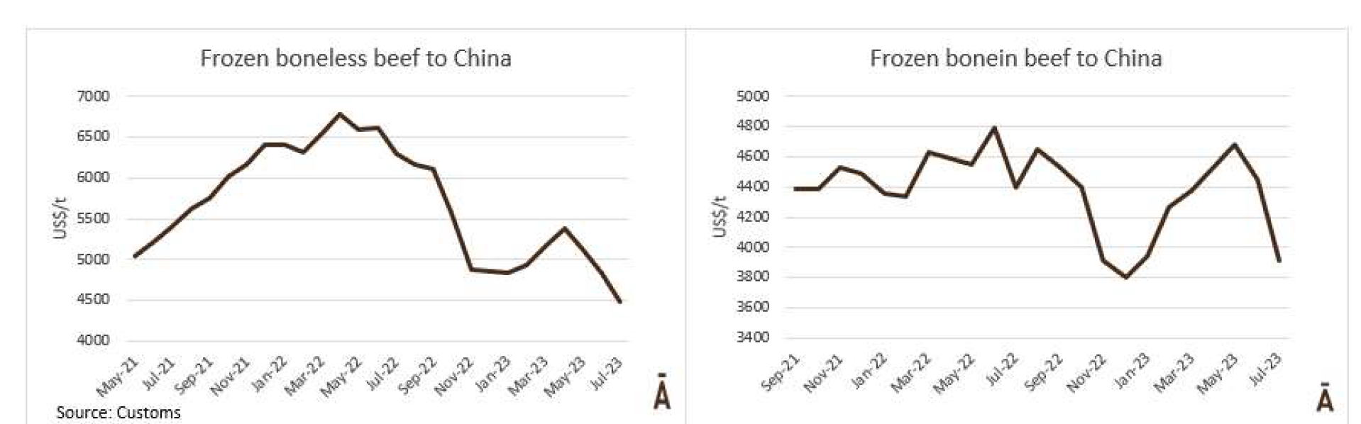 7月份,出口中國的帶骨牛肉為4469噸,平均價格是3914美元/噸。去無骨牛肉為10083噸,平均價格為4491美元/噸,這個月的價格有一個暴跌。出口中國的冷凍牛肉平均價格為4312美元/噸,為9個月前2021年2月以來的最低值。在截至7月的累計一年中去骨牛肉下降了35%,帶骨牛肉下降了13%。