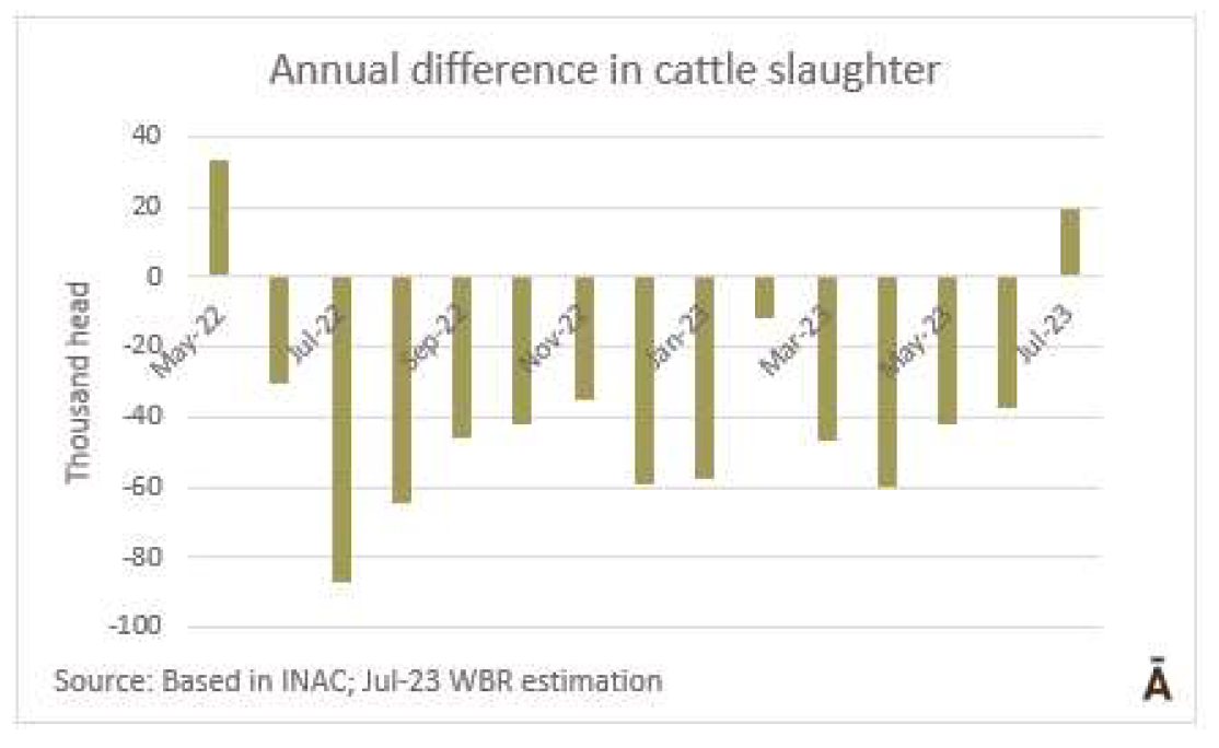 根據SENASA臨時數(shù)據,7月份的屠宰許可包括129萬頭牛,比前一個月減少了1%,但是比一年前增加了14%。年度增幅最大的品種是小母牛(26%),其次是奶牛(19%)和幼牛(16%),對公牛的屠宰沒有改變。與5月和6月的比例一致,7月母牛屠宰比例為48.7%,比去年同月增加了三個百分點。
