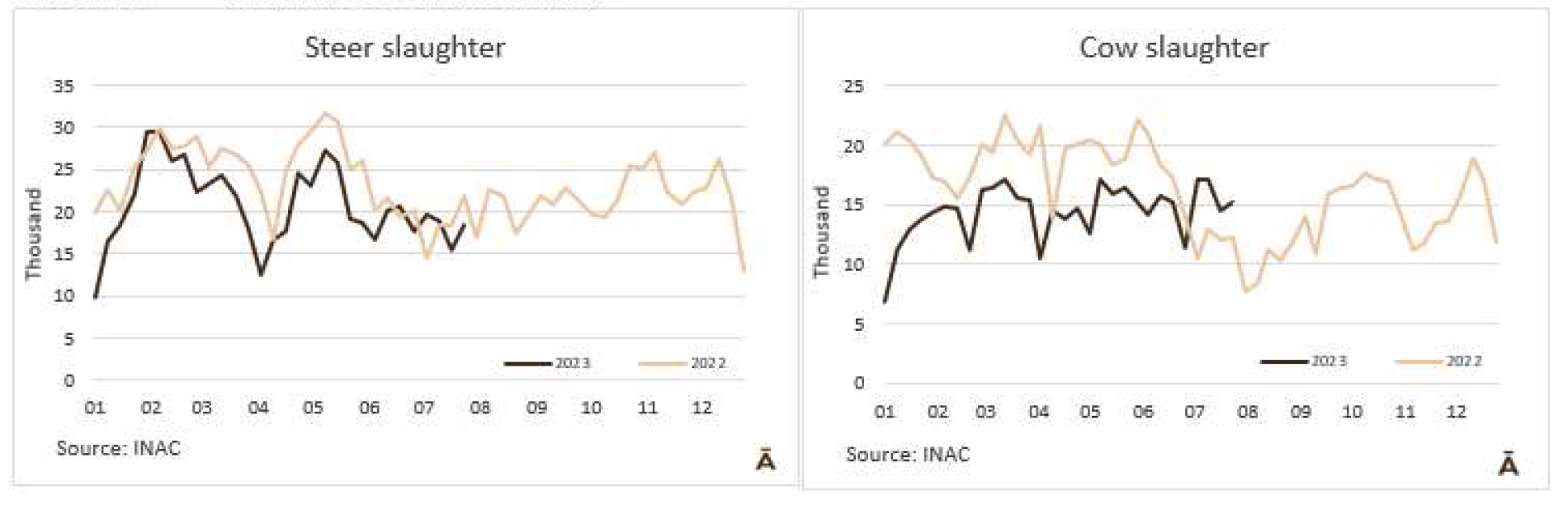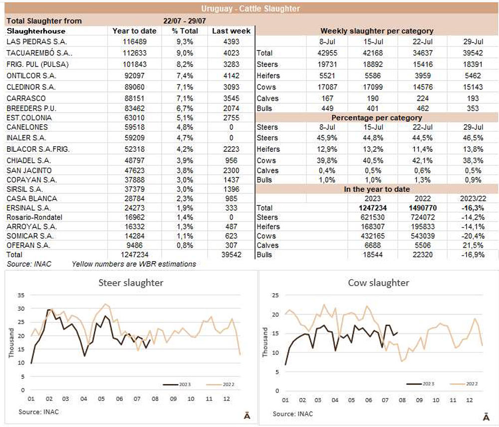 牛的屠宰量連續(xù)兩周保持在40000頭以下。INAC報告稱,在截至7月29日的一周內,有39542頭牛進入工廠,比前一周(由于7月18日假期)多了近5000頭,但比去年同期減少了2%。隨著481配額活動的開始,被屠宰的公牛和小母牛的比例有所增加,而奶牛的比例有所下降。與前一周相比,公牛增加了19%達到了18391頭,小母牛增加了38%達到5462頭,而奶牛只增加了4%,數(shù)量為15143頭,占屠宰總數(shù)的38%,比前一周減少了4個百分點。屠宰量最多的工廠為Las Piedras(4393)、Ontilcor(4142)和Marfrig-Tacuarembo(4023)。Marfrig屠宰量是9871頭(每周增加13%),而其他兩個工廠屠宰了6828頭牛(每周減少4%)。今年7月有161731頭牛被屠宰,去年7月只有149300頭牛被屠宰,因此年度比較有所增加,這是前13個月沒有發(fā)生過的