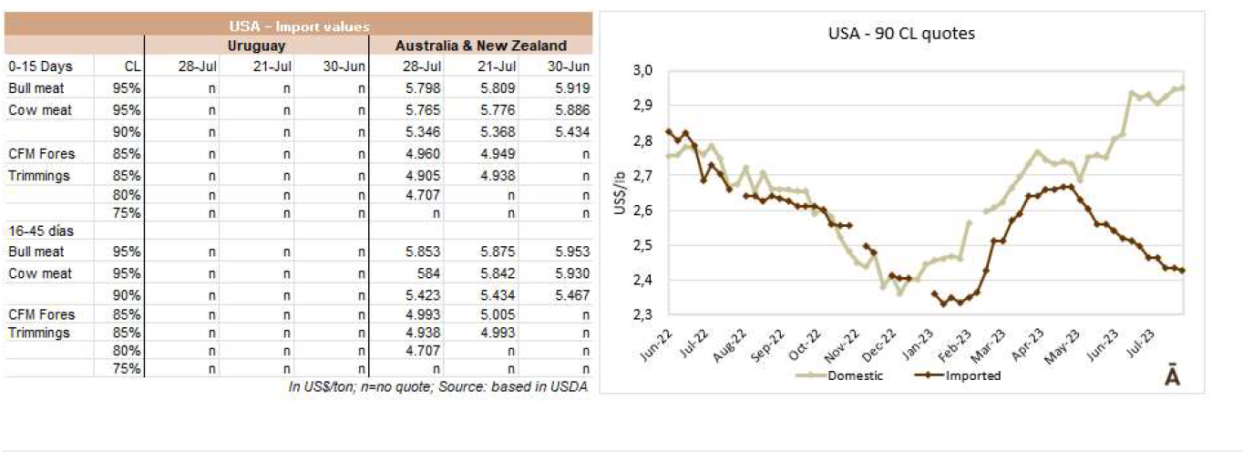 一位貿易商表示,在大洋洲(新西蘭和澳大利亞)大量牛肉供應占主導地位的情況下,美國進口市場并沒有表現(xiàn)出很大的變化。烏拉圭配額內牛前部位肉90CL的參考價格為FOB 4550美元每噸。