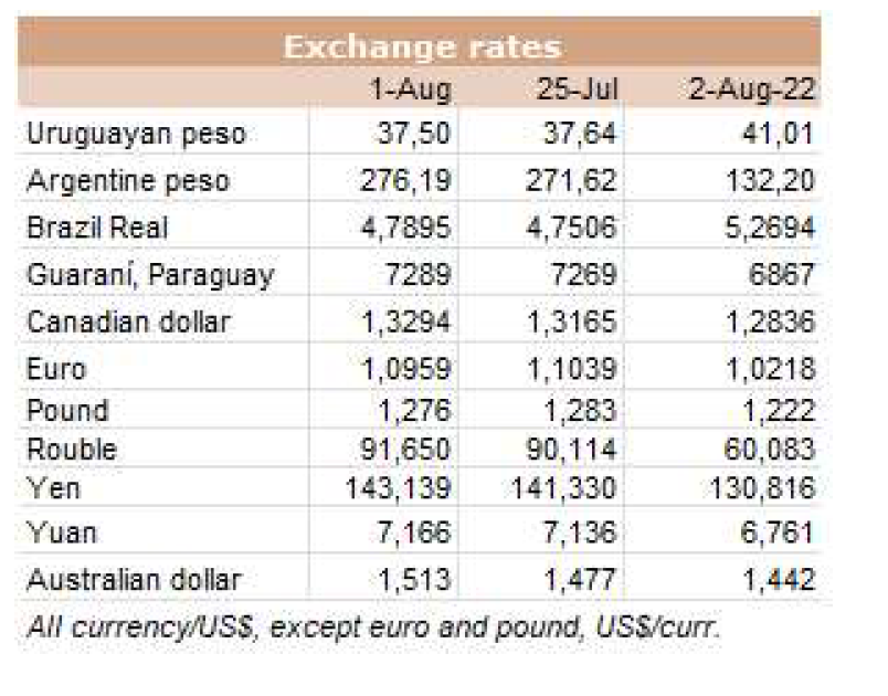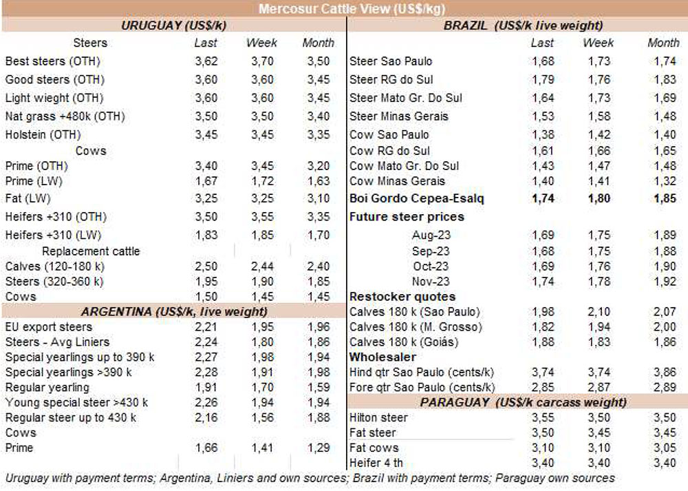 阿根廷出口公牛的價格本周爆炸式增長了50美分至每公斤酮體4.30美元(包括9%的出口稅)。而巴西恰恰相反,那里的包裝公司被收購以此壓低價格。出口州的平均每公斤損失9美分至每公斤3.02美元,成為該地區(qū)的最低價格參考值。烏拉圭的牛的價格也面臨下行壓力,主要是質量最重、最好的公牛,價格為3.60美元左右。在巴拉圭,良好的飼料條件要求牛肉維持3.50美元左右的市場價格。