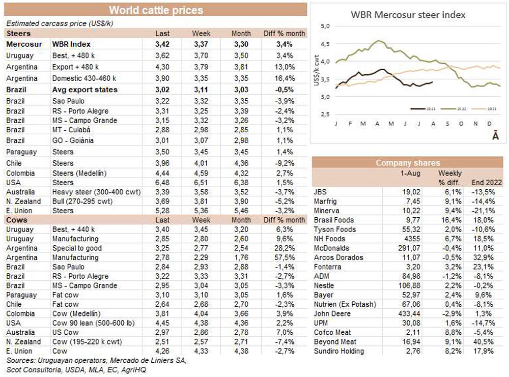 上周末,阿根廷農場到屠宰場的價格大幅上漲,并推高了地區(qū)平均值,盡管巴西本周呈下跌趨勢。WBR南方共同市場公牛指數(shù)上漲5美分至每公斤酮體3.42美元,為10周來的最高值。