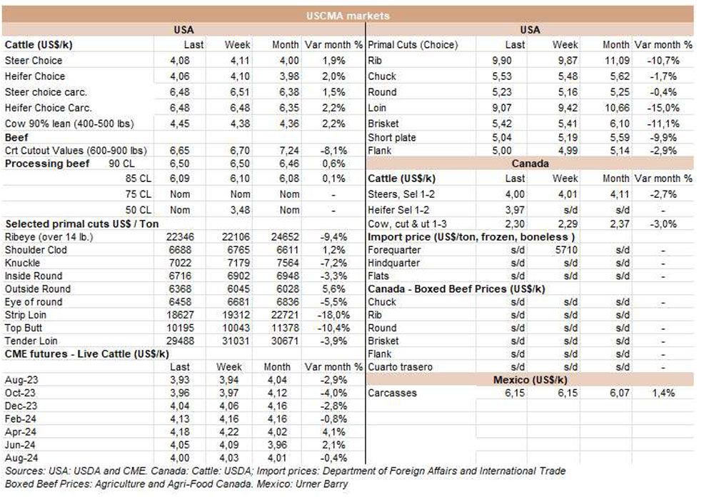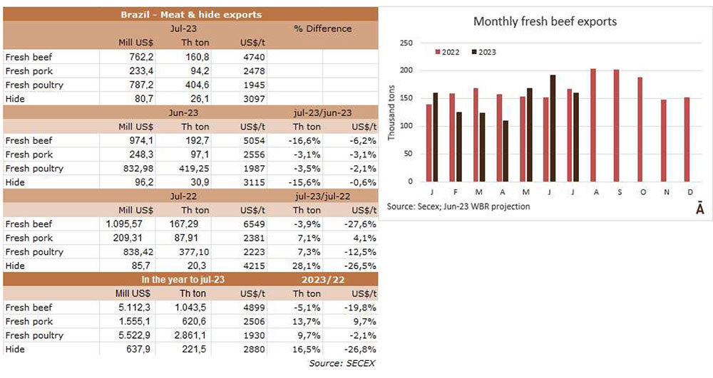 根據外貿部(SECEX)的信息,巴西7月份出口了160795噸牛肉,平均價值為4740美元/噸。與6月份相比,產量減少了近3.2萬噸,但同比僅減少了6.5萬噸。平均出口價格在月度比較中下降6.2%,在年度比較中下降27.6%。因此,與去年同月相比,巴西的出口量在5月和6月出現(xiàn)了復蘇。今年至7月份,巴西出口了104萬噸牛肉,比2022年同期減少了5.6萬噸(-5.1%);與每噸4899美元相比,平均出口價格下降了20%。