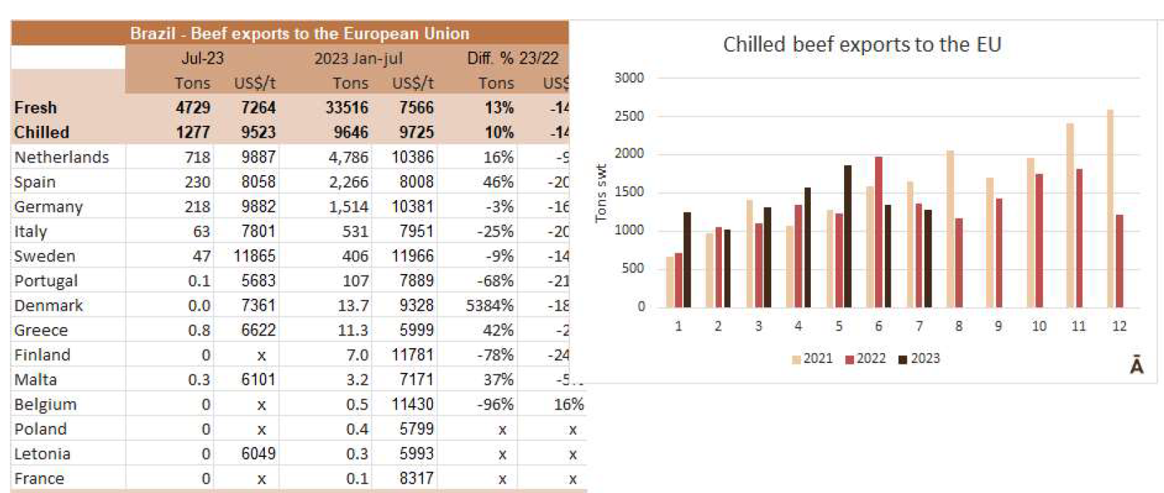 巴西向歐盟國(guó)家出口了1277噸冰鮮牛肉,比6月份減少了70噸,是自2月份以來(lái)的最低出口量。當(dāng)月凍結(jié)出口累計(jì)3452噸,比6月份增加464噸。