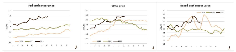 事實(shí)上,2022/23財(cái)政年度的牛庫(kù)存有所增加。畜牧部在9月份報(bào)告初步數(shù)據(jù)時(shí),顯示這個(gè)數(shù)字肯定會(huì)比去年多出30-35萬(wàn)只。當(dāng)畜牧部在9月份報(bào)告初步數(shù)據(jù)時(shí),這個(gè)數(shù)字肯定會(huì)比去年多出300-35萬(wàn)只。一方面,屠宰量急劇下降,從2021/22年度的274萬(wàn)頭下降到215萬(wàn),減少了57萬(wàn)頭牛??偟膩?lái)說(shuō),鑒于2022年下半年活牛產(chǎn)量幾乎為零,除上半年增長(zhǎng)外,兩年的活牛出口略有收縮。除此之外,還有對(duì)良好產(chǎn)仔和斷奶的預(yù)期。根據(jù)INIA妊娠研討會(huì)的數(shù)據(jù),2022年的妊娠率達(dá)到了80%。因此,隨著懷孕和斷奶的時(shí)間減少,6月30日統(tǒng)計(jì)的小牛數(shù)量幾乎肯定超過了290萬(wàn)頭。考慮到出欄和小牛的進(jìn)入,牛群將增加約30-35萬(wàn)頭達(dá)到約1186萬(wàn)頭的數(shù)量。2023/24財(cái)政年,受干旱的影響,牛群數(shù)量很可能會(huì)減少。今年的INIA妊娠研討會(huì)報(bào)告稱,與前一年相比,妊娠率下降了9個(gè)百分點(diǎn),因此斷奶率將略高于60%。明年6月30日的小牛數(shù)量肯定會(huì)減少約30萬(wàn)達(dá)到260萬(wàn)頭。2023/24年初的國(guó)際市場(chǎng)狀況和對(duì)中國(guó)經(jīng)濟(jì)發(fā)展的預(yù)期不容樂觀,因?yàn)閺?qiáng)烈的購(gòu)買壓力將加快屠宰速度,因此屠宰量可能會(huì)接近200萬(wàn)頭牛,2023/24財(cái)政年度末的牛群數(shù)量可能會(huì)減少約10萬(wàn)頭。