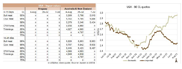 上周屠宰量大幅上升。INAC報(bào)告稱,截至8月6日,有45086頭牛進(jìn)入屠宰場(chǎng),比上一次增加了5500頭,是自5月中旬以來(lái)的最高值。屠宰的組成比例清楚地反應(yīng)了481配額。小母牛是增長(zhǎng)數(shù)量最多的,總共有7067頭,這是自2月份以來(lái)的最高值。本周,公牛增加2700頭達(dá)到了21112頭。不屬于配額的奶牛僅占屠宰量的36%,有16188頭。本周屠宰最多的工廠是Marfrig-Tacuarembo(5140)、Las Piedras(4853)和Ontilcor(4247)。7月份屠宰量是169558頭牛,同比增長(zhǎng)了13.6%。這是自2022年5月以來(lái),年度牛屠宰量首次增加。