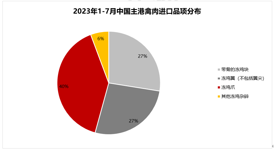 20237月中國(guó)主港進(jìn)口禽肉數(shù)量11.58萬(wàn)噸,環(huán)比減少16%,同比增長(zhǎng)24%。進(jìn)口金額3.76億美元,環(huán)比下滑15%,同比上漲4%。1-7月,中國(guó)主港進(jìn)口禽肉共計(jì)81.53萬(wàn)噸,同比增長(zhǎng)35%。進(jìn)口總額26.36億美元,同比增長(zhǎng)32%。從進(jìn)口國(guó)別看,1-7月,從巴西進(jìn)口禽肉41.83萬(wàn)噸,同比增長(zhǎng)74%,占比51%。從美國(guó)進(jìn)口禽肉15.73萬(wàn)噸,同比減少3%,占比19%。從俄羅斯進(jìn)口禽肉7.69萬(wàn)噸,同比增長(zhǎng)6%,占比9%。從泰國(guó)進(jìn)口禽肉6.54萬(wàn)噸,同比增長(zhǎng)79%,占比8%。從進(jìn)口品項(xiàng)看,凍雞爪進(jìn)口總量32.67萬(wàn)噸,占比40%。帶骨的凍雞塊進(jìn)口總量22.454萬(wàn)噸,占比27%。凍雞翼(不包括翼尖)進(jìn)口總量21.80萬(wàn)噸,占比27%。其他凍雞雜碎進(jìn)口總量4.64萬(wàn)噸,占比6%。
