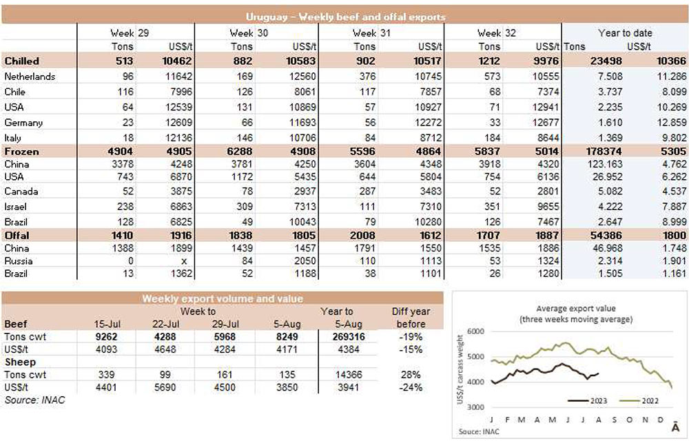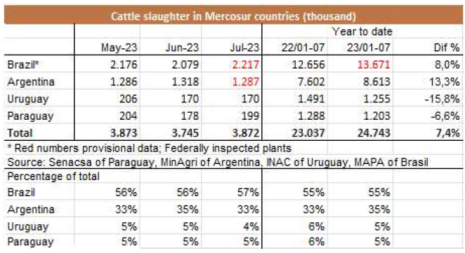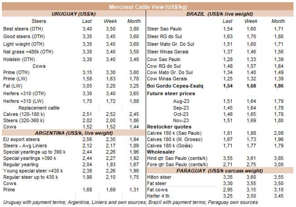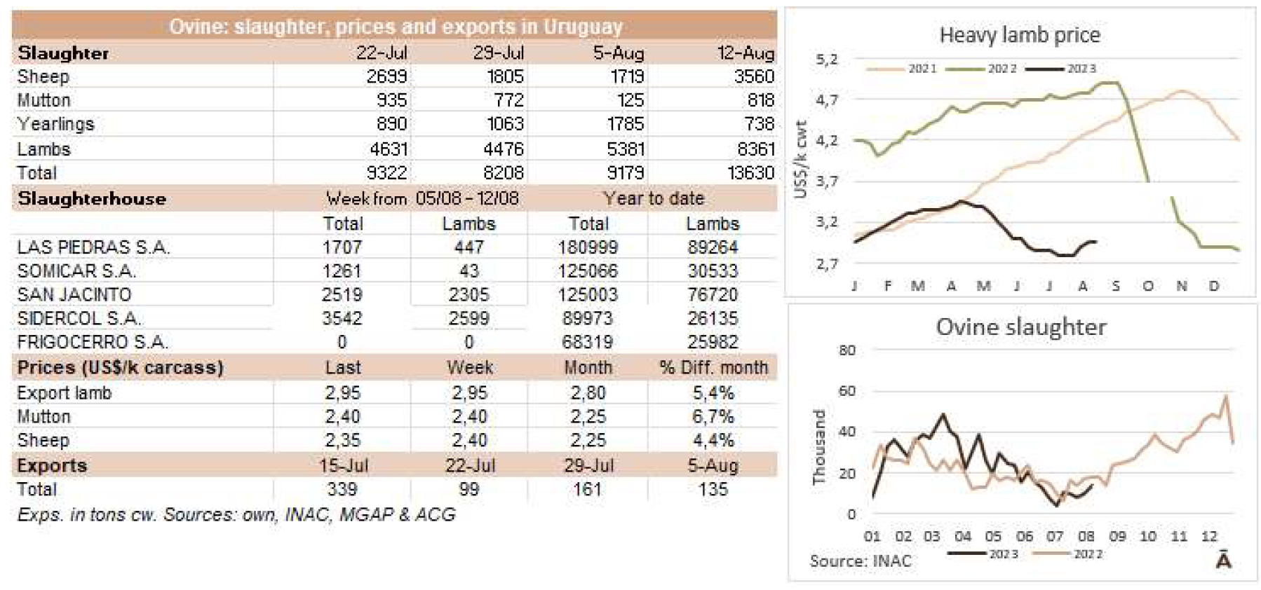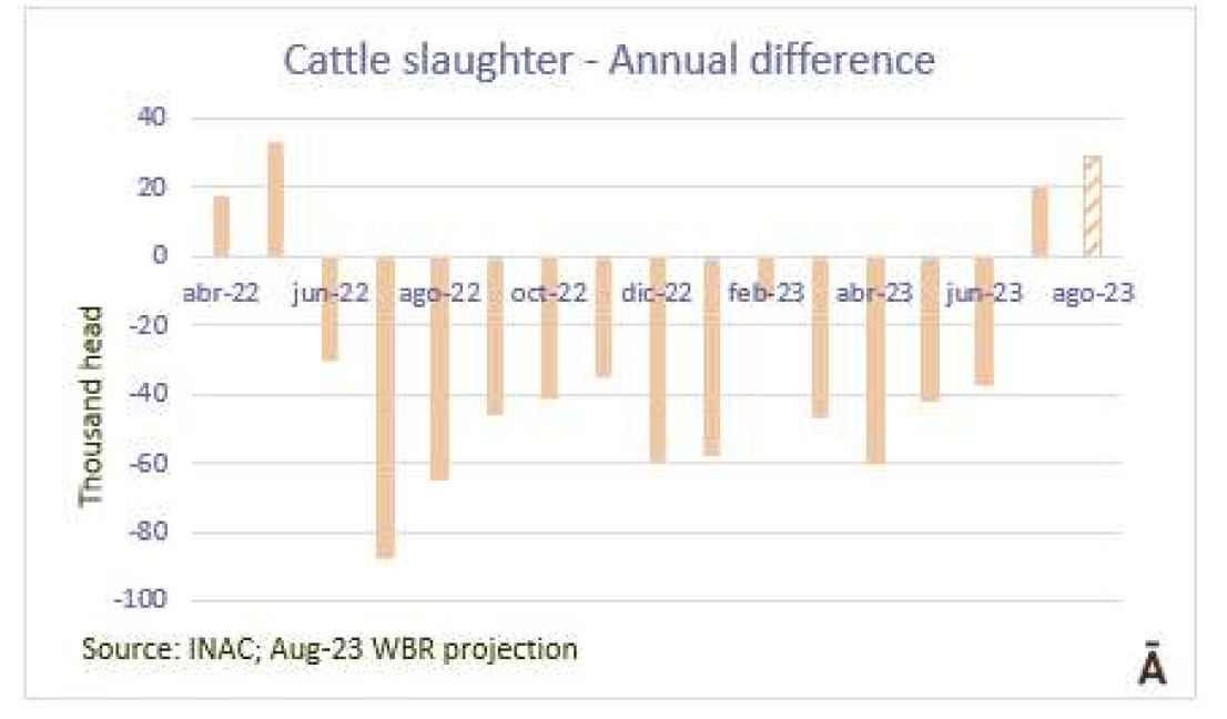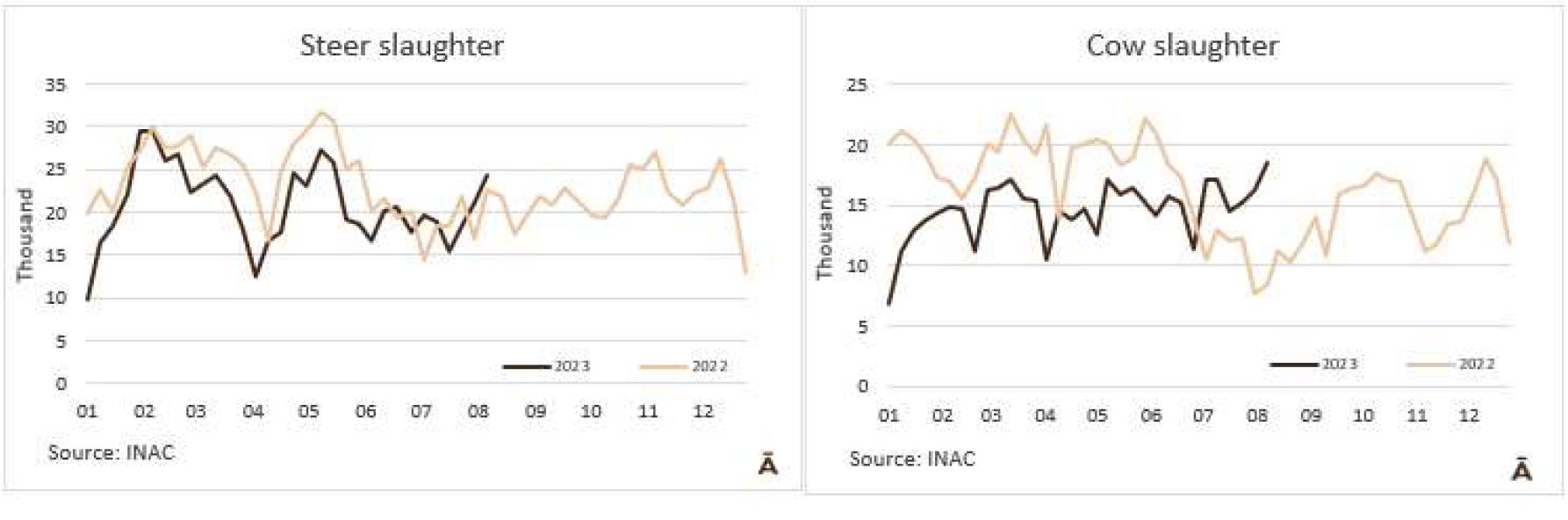 上周的牛屠宰量接近5萬(wàn)頭,是自5月第二周以來(lái)數(shù)量最多的一周,當(dāng)時(shí)屠宰場(chǎng)也在積極為481配額窗口工作。INAC報(bào)告稱,在截至8月12日的一周內(nèi),有49648頭牛進(jìn)入工廠,比前一周增加了10%,比去年同期的37000頭增加了33%。屠宰量最大是Las Piedras(5193)、Marfrig-Tacuaremb6(5100)和Minerva Carrasco(3732)。擁有三個(gè)工廠的Marfrig屠宰了10927頭牛(周比較為-255頭),而同樣擁有三個(gè)工廠的Minerva屠宰了10590頭牛(周增加3552頭)。Marfrig lnaler本周再次開始恢復(fù)生產(chǎn),而Cledinor下周將進(jìn)入許可期。就Minerva而言,從下周開始,它將進(jìn)入卡拉斯科工廠的許可期。截至8月,共有86907頭牛被屠宰,比去年同期多36%。事實(shí)上,牛的屠宰量將連續(xù)第二個(gè)月高于2022年。
