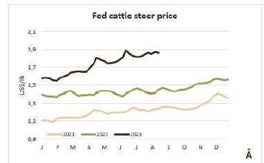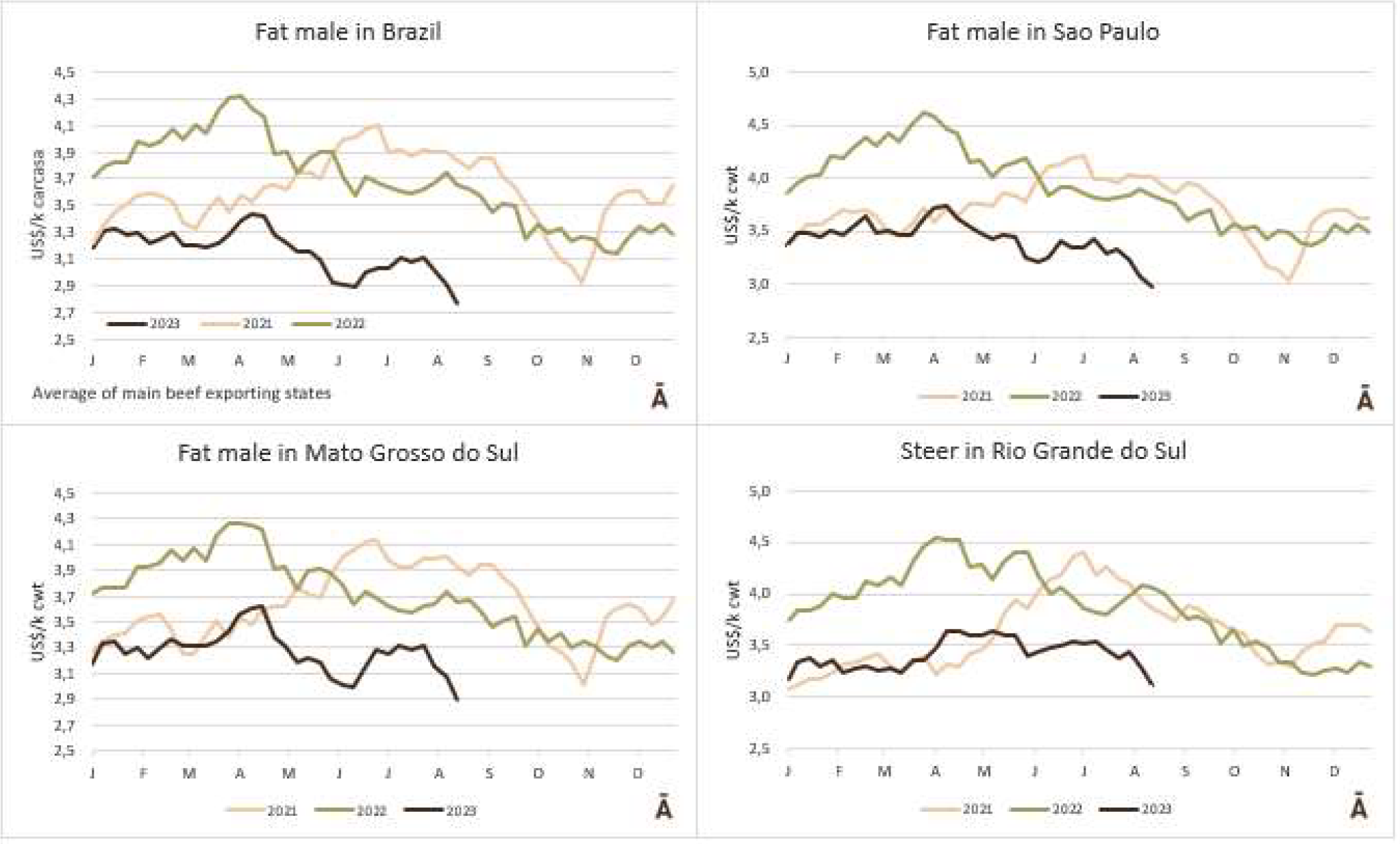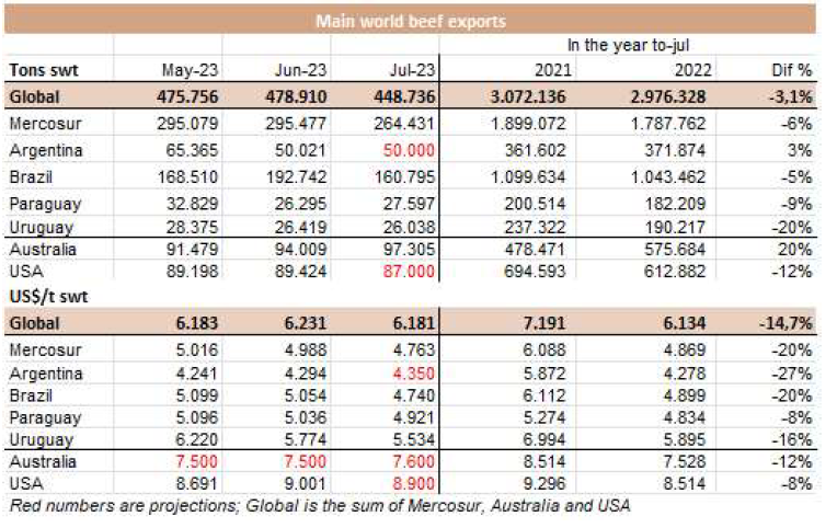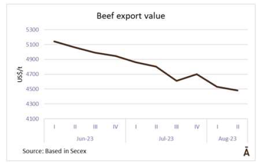 根據(jù)外貿(mào)部的數(shù)據(jù),8月第二周,巴西以每噸4482的平均價(jià)格出口了42077噸牛肉。平均價(jià)格為4500美元/噸,比6月第一周的平均價(jià)格每噸低600美元(-13%)。在8月的前9個(gè)工作日,巴西以每噸4507的平均價(jià)格出口了83344噸牛肉。預(yù)計(jì)月底的產(chǎn)量將略低于20萬(wàn)噸,這意味著與2022年8月的20.3萬(wàn)噸相比將略有下降。