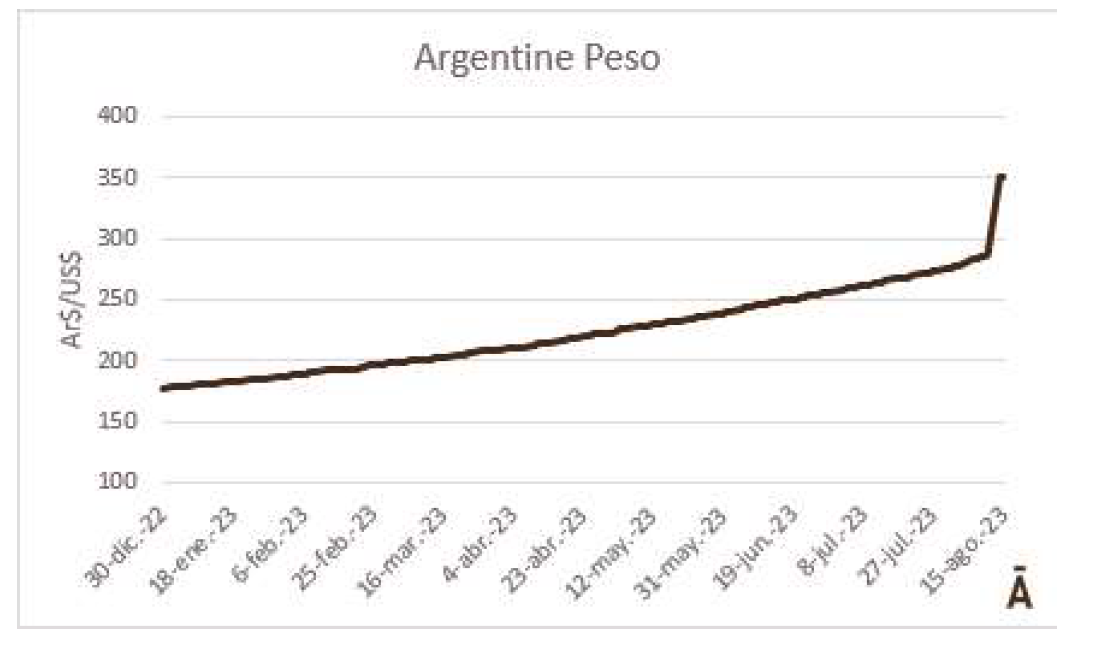 周日的選舉結(jié)果顯示,得票最多的候選人是哈維爾·米利,他是一位經(jīng)濟(jì)學(xué)家,在2021年之 前沒(méi)有政治生涯,提出了極端自由主義的建議。周日,被稱為“加密貨幣”的金融美元上漲了約10%。周一,根據(jù)國(guó)際貨幣基金組織發(fā)放資金的要求,政府將阿根廷比索貶值22%,以縮小其與自由美元之間超過(guò)100%的匯率差距。然而,隨著非官方匯率升至700比索以上,這一差距立即再次擴(kuò)大。所有這些不確定性,在一個(gè)更加微妙的情況下,導(dǎo)致所有行業(yè)的銷售額普遍下降。昨天,政府與超市和食品公司召開緊急會(huì)議,試圖阻止價(jià)格上漲。