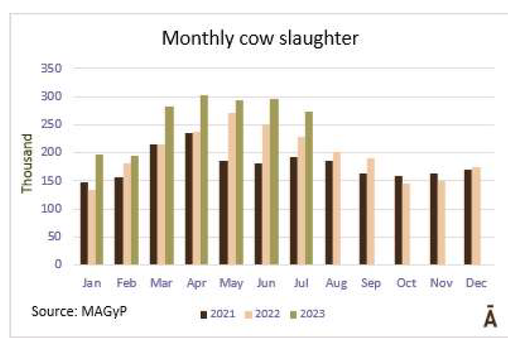7月份,共屠宰129萬(wàn)頭牛,比上月減少2%,比去年同月增加16%.根據(jù)官方數(shù)據(jù)。在今年的前7個(gè)月,861萬(wàn)頭牛被屠宰,年增長(zhǎng)率為13%,這是自2009年大清算以來(lái)的最大增幅,該清算使該國(guó)的牛存欄減少了20%。與2022年相比,2023年的增長(zhǎng)尤其體現(xiàn)在屠宰量增長(zhǎng)了21%,然后是小母牛增長(zhǎng)了14%,其次是幼牛,年增長(zhǎng)了12%。7月份,母牛屠宰量占總數(shù)的48.5%以上。今年到目前為止,這一比例約為47.5%,而2022年同期為46%。