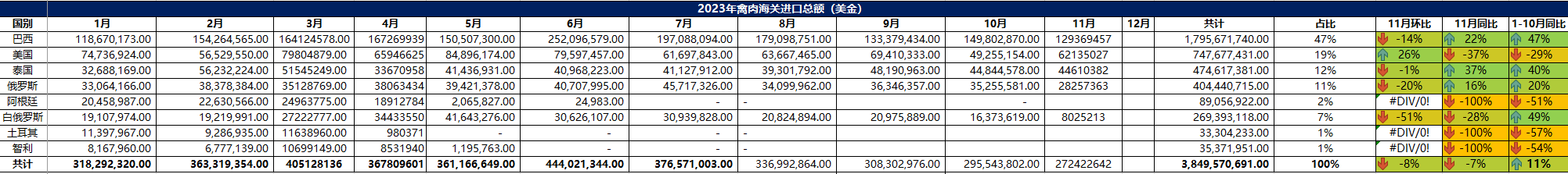 2023 年 11月冷凍禽肉進(jìn)口概況