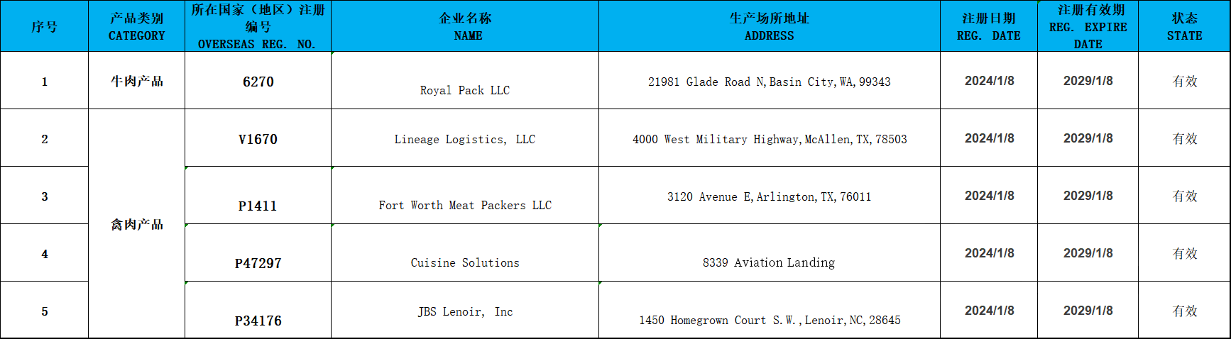 符合評估審查要求的國家或地區(qū)輸華肉類產(chǎn)品名單(2024年1月8日更新)