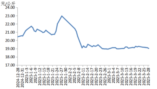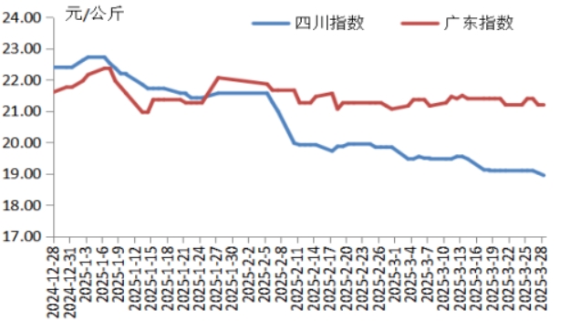 本周,廣東地區(qū)豬肉周均價為每公斤21.28元,環(huán)比下跌0.4%,同比下跌1.1%,結(jié)束了同比上漲趨勢。周前期,生豬供應較為平穩(wěn),屠宰企業(yè)按需收購,生豬及豬肉價格以穩(wěn)定為主;周中期,散養(yǎng)戶和規(guī)模養(yǎng)殖場出欄節(jié)奏放慢,生豬及豬肉供應短時收緊,支撐豬肉價格小幅反彈;周后期,周邊市場豬肉價格下跌,本地區(qū)經(jīng)銷商和消費者壓價采購,屠宰企業(yè)為保證銷量降低售價??傮w看,廣東地區(qū)豬肉周均價環(huán)比微跌。
